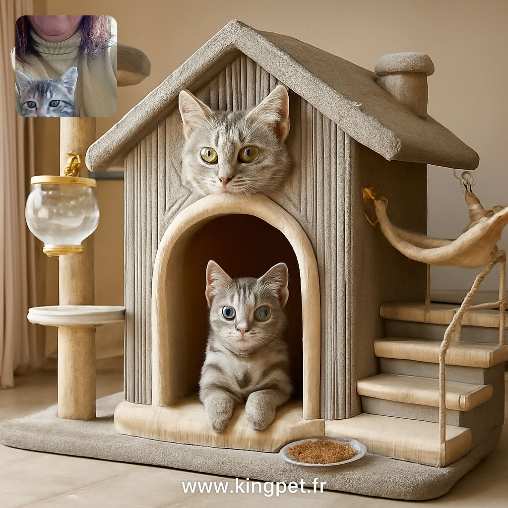 • A majestic, fluffy cat lounges regally on a tiled floor, its golden eyes staring intently like a furry lion surveying its kingdom. The background is a cozy home setting with a TV and cat tree, while a colorful toy rope hints at playful moments.