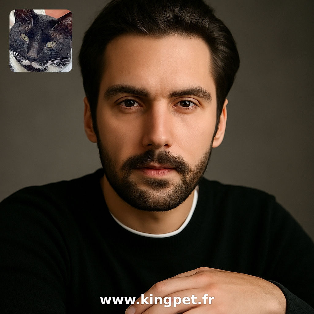 • A tuxedo cat with striking green eyes sits elegantly on the edge of a bathtub in a modern bathroom with marble-patterned walls. The cat looks curiously at the camera, while bathroom items like a toothbrush and lotion are neatly arranged nearby.