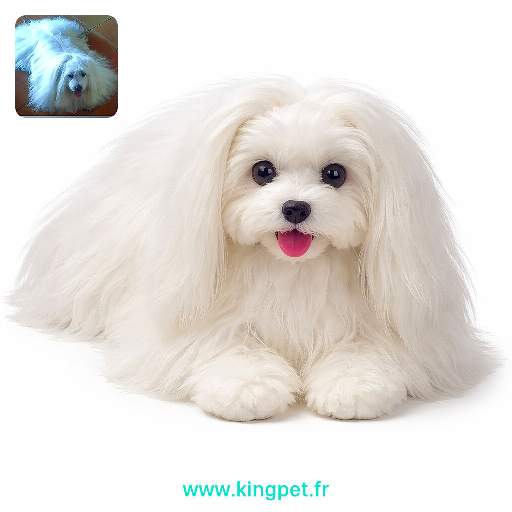 • A fluffy dog with a majestic mane sits proudly on a patterned floor, looking up with soulful eyes as if waiting for a treat or a royal command.