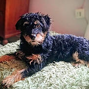 • Pépite participe au concours pour gagner de l'argent avec cette photo : dog, black_dog, tan_dog, curly_fur, pet, indoor, blanket, furniture, cozy, relaxed, lying_down, looking_at_camera, animal, cute, companion, home, fur, paw, snout, portrait