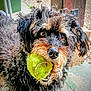• Pépite a rejoint le concours — aidez-le/la à gagner de superbes lots ! dog, tennis_ball, curly_fur, outdoor, pet, animal, mouth, close_up, playful, black_fur, brown_fur, nose, eyes, texture, background, concrete, wood, fur, canine, toy